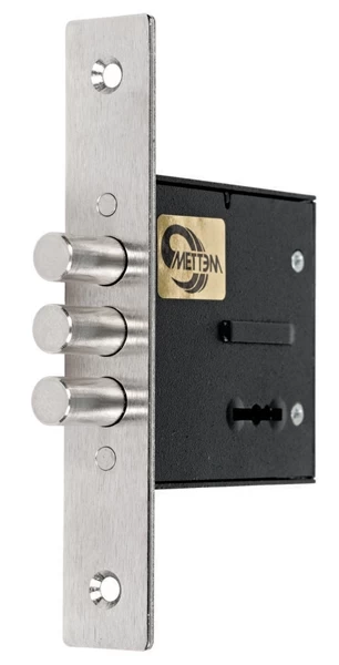 Замок врезной 6-сувальдный ЗВ8 852.0.0 сертифицирован на соответствие 2 классу ГОСТ. Подходит для установки как во входные двери (в качестве дополнительного запирающего устройства), так и в дверцы металлических шкафов. Замок имеет одно направление запирания — тремя стальными ригелями диаметром 12 мм, которые выдвигаются из корпуса замка на 22 мм. Замок запирает дверь на два полных полуоборота. Модель комплектуется лицевой планкой из высококачественной стали, а также двумя декоративными накладками на ключевую скважину из нержавеющей стали. В комплекте 5 латунных ключей с пластиковой головкой. Замок не имеет защелки, поэтому рекомендуется к применению в качестве второго запирающего устройства.